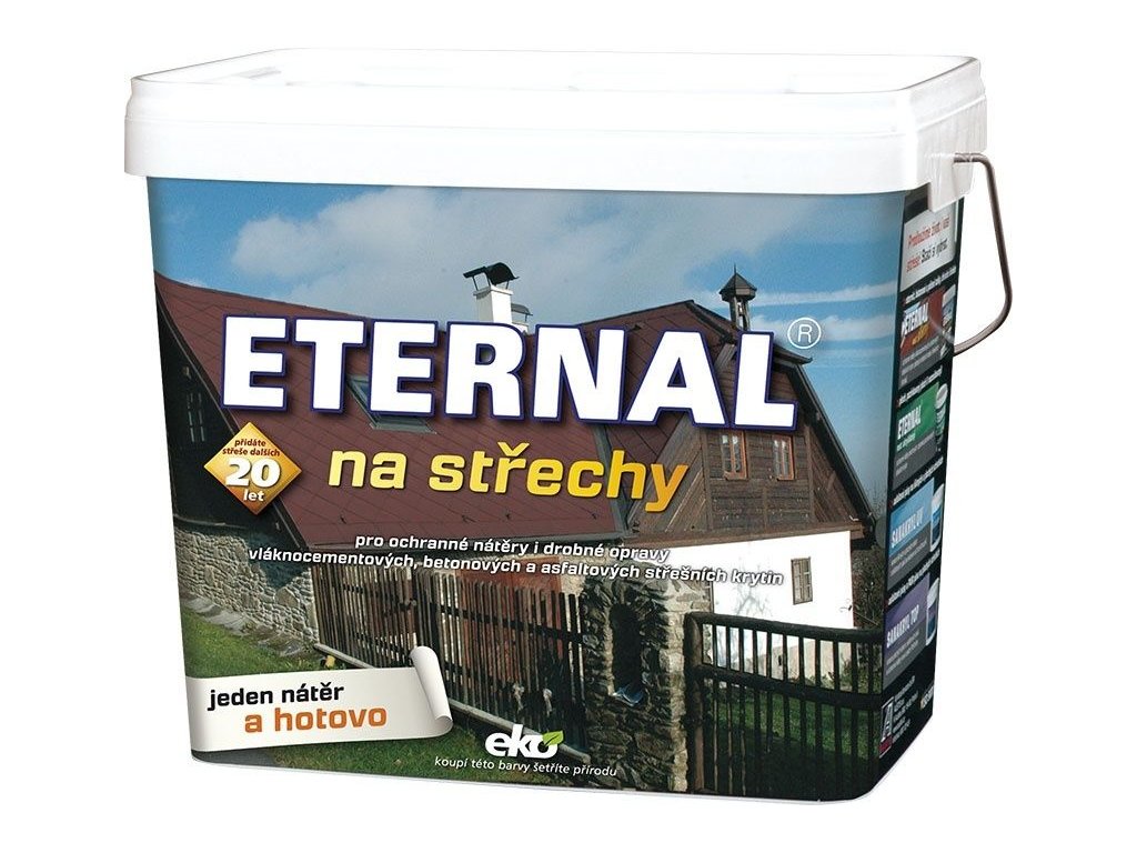ETERNAL na strechy je určený k údržbe strešnej krytiny z vláknocementu, betónových a neglazovaných pálených strešných tašiek a drevených šindeľov na strechách so sklonom minimálne 10°. ETERNAL na strechy po zaschnutí vytvára vodotesný náterový film s vysokou súdržnosťou k podkladu, dlhodobou životnosťou, odolný UV žiareniu a trvalo pružný i pri nízkych teplotách. Pomocou náterové hmoty ETERNAL na strechy je možné zakryť a utesniť drobné trhlinky v podkladu.